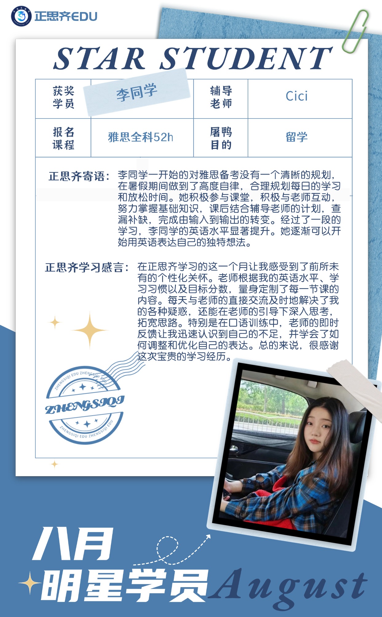 李同学一开始的对雅思备考没有一个清晰的规划,在暑假期间做到了高度自律,合理规划每日的学习和放松时间。她积极参与课堂,积极与老师互动,努力掌握基础知识,课后结合辅导老师的计划,查漏补缺,完成由输入到输出的转变。经过了一段的学习,李同学的英语水平显著提升。她逐渐可以开始用英语表达自己的独特想法。