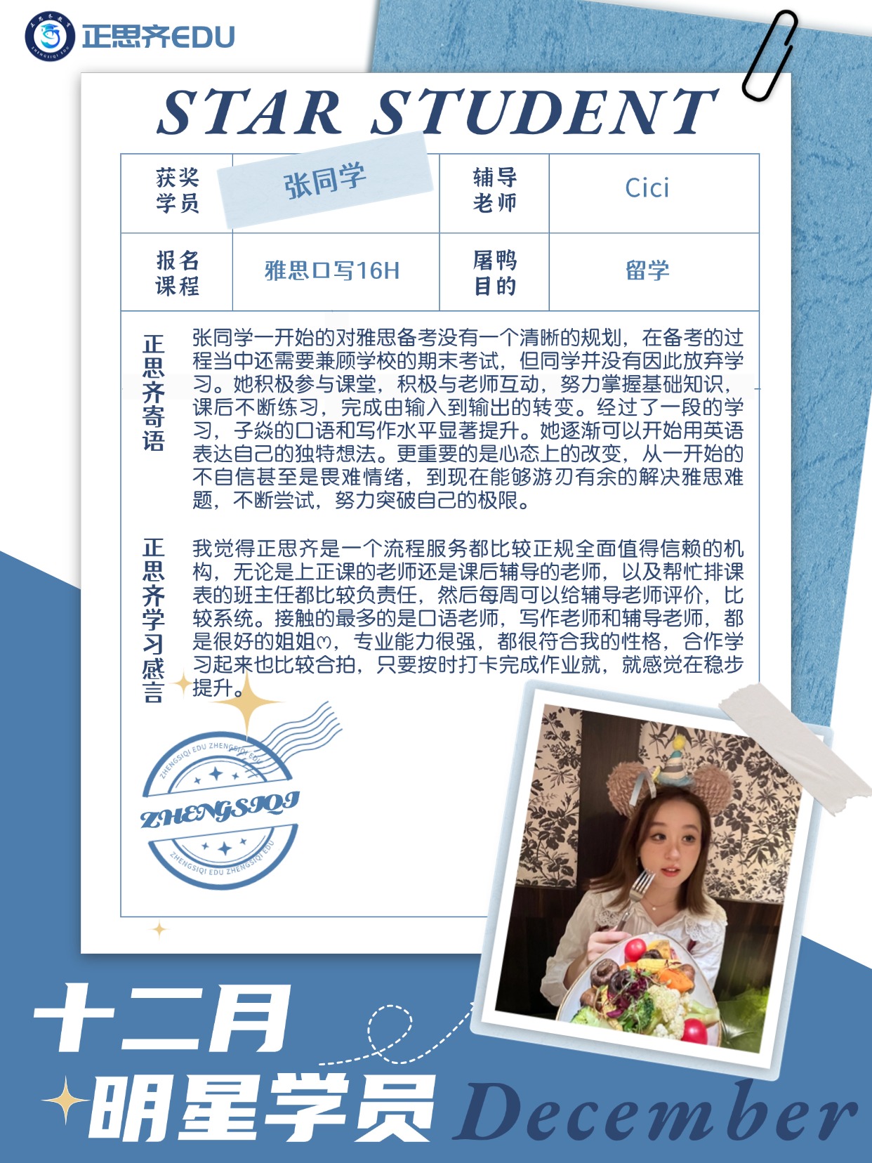 正思齐寄语: 王同学一开始对于雅思学习如何着手并不是很清晰,尤其是在学校也有任务的情况下,学习时间比较有限,但她并没有放弃,准时参与课堂,积极与老师互动,努力掌握基础知识,课后不断练习,坚持每天至少梳理录音1个口语话题,完成由输入到输出的转变。经过了一段的学习,王同学的口语水平显著提升。她逐渐可以开始用英语表达自己的独特想法,更重要的是心态上的改变,从一开始的不知道说什么,到现在对于每个话题都能有自己观点的流利表达,发音进步也非常大,希望王同学可以继续保持这份热情,不断提升自己,继续加油。 正思齐学习感言:学习雅思口语的这段时间,我受益匪浅。口语老师不仅耐心纠正我的发音和语法错误,还主动帮助我克服紧张情绪。课堂互动性强,老师会针对不同话题引导深入讨论,让我对如何逻辑清晰地表达观点有了深入了解。课后提供的个性化反馈和练习建议,让我的流利度和词汇运用都有了很大提升。