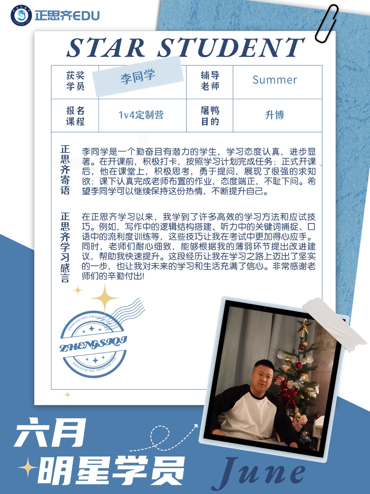 从4月开始在正思齐学习雅思,这一个多月的学习时光,真的收获满满,超幸运遇到这群宝藏老师!Sue老师的阅读课超欢乐,边讲干货边穿插趣味拓展;Sigrace老师严谨细致,毫无保留分享听力技巧,课后反馈精准到位。Christian老师像情绪稳定的卡皮巴拉,课堂上耐心等我们回答并引导我们写作思路,课后批改作业细致入微;Elvira老师的口语课活力满满,互动频繁且技巧实用。辅导老师Cici更是尽心负责,每天认真批改作业,连口语发音小问题都不放过,及时为我答疑解惑!在老师们的悉心指导下,我的英语能力有了很大的提升,感恩遇见。