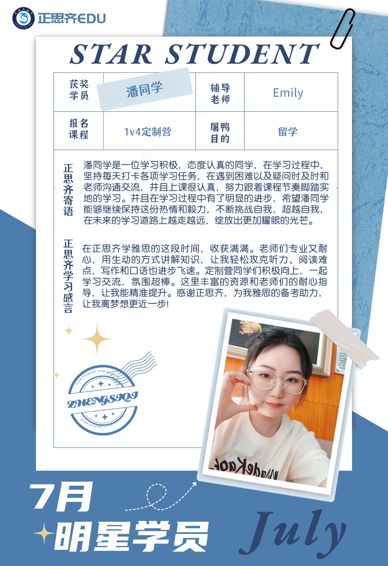 正思齐寄语: 丁同学一开始的对雅思备考没有一个清晰的规划,在备考的过程当中需要参加学校课程和考试,但同学并没有因此放弃学习。她每天制定清晰的学习计划,积极参与课堂,积极与老师互动,努力掌握基础知识,课后不断练习,完成由输入到输出的转变。经过了一个多月的学习,丁同学的英语水平显著提升。她逐渐可以分析雅思阅读文章,并开始用英语表达自己的独特想法。更重要的是心态上的改变,从一开始的不自信甚至是畏难情绪,到现在能够游刃有余的解决雅思难题,不断尝试,努力突破自己的极限。 正思齐学习感言: 从4月开始在正思齐学习雅思,这一个多月的学习时光,真的收获满满,超幸运遇到这群宝藏老师!Sue老师的阅读课超欢乐,边讲干货边穿插趣味拓展;Sigrace老师严谨细致,毫无保留分享听力技巧,课后反馈精准到位。Christian老师像情绪稳定的卡皮巴拉,课堂上耐心等我们回答并引导我们写作思路,课后批改作业细致入微;Elvira老师的口语课活力满满,互动频繁且技巧实用。辅导老师Cici更是尽心负责,每天认真批改作业,连口语发音小问题都不放过,及时为我答疑解惑!在老师们的悉心指导下,我的英语能力有了很大的提升,感恩遇见。