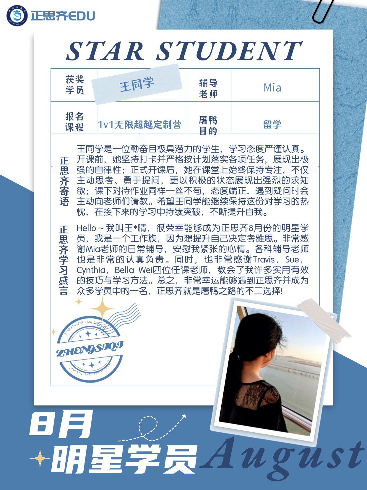 从4月开始在正思齐学习雅思,这一个多月的学习时光,真的收获满满,超幸运遇到这群宝藏老师!Sue老师的阅读课超欢乐,边讲干货边穿插趣味拓展;Sigrace老师严谨细致,毫无保留分享听力技巧,课后反馈精准到位。Christian老师像情绪稳定的卡皮巴拉,课堂上耐心等我们回答并引导我们写作思路,课后批改作业细致入微;Elvira老师的口语课活力满满,互动频繁且技巧实用。辅导老师Cici更是尽心负责,每天认真批改作业,连口语发音小问题都不放过,及时为我答疑解惑!在老师们的悉心指导下,我的英语能力有了很大的提升,感恩遇见。