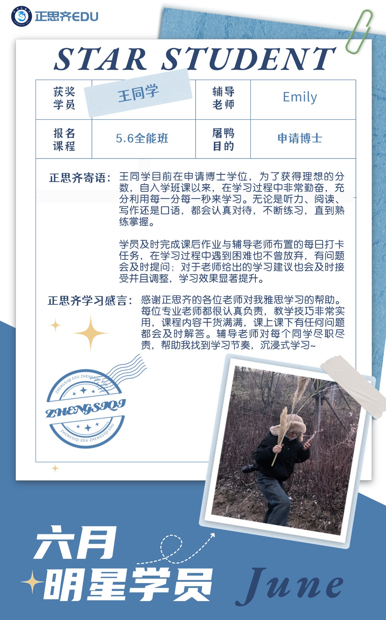 正思齐寄语: 丁同学一开始的对雅思备考没有一个清晰的规划,在备考的过程当中需要参加学校课程和考试,但同学并没有因此放弃学习。她每天制定清晰的学习计划,积极参与课堂,积极与老师互动,努力掌握基础知识,课后不断练习,完成由输入到输出的转变。经过了一个多月的学习,丁同学的英语水平显著提升。她逐渐可以分析雅思阅读文章,并开始用英语表达自己的独特想法。更重要的是心态上的改变,从一开始的不自信甚至是畏难情绪,到现在能够游刃有余的解决雅思难题,不断尝试,努力突破自己的极限。 正思齐学习感言: 从4月开始在正思齐学习雅思,这一个多月的学习时光,真的收获满满,超幸运遇到这群宝藏老师!Sue老师的阅读课超欢乐,边讲干货边穿插趣味拓展;Sigrace老师严谨细致,毫无保留分享听力技巧,课后反馈精准到位。Christian老师像情绪稳定的卡皮巴拉,课堂上耐心等我们回答并引导我们写作思路,课后批改作业细致入微;Elvira老师的口语课活力满满,互动频繁且技巧实用。辅导老师Cici更是尽心负责,每天认真批改作业,连口语发音小问题都不放过,及时为我答疑解惑!在老师们的悉心指导下,我的英语能力有了很大的提升,感恩遇见。